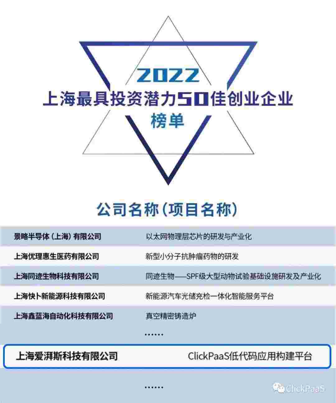小米钱包 作为国内低代码PaaS平台的领军企业,,与120家创企入围角逐。。。期间接受了来自德同资本、、、领中资本等知名投资机构的10位投资人组成专家评委团的背靠背盲选。。。并最终入围“2022上海最具投资潜力50佳创业企业”榜单,,,被列入“上海市重点培育创业企业库”。。。。